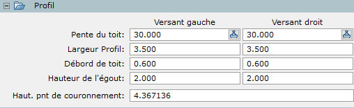 - La modification des valeurs de profil « Pente du toit« , « Largeur Profil« , « Débord de toit« ou « Hauteur de l’égout« entraîne un nouveau calcul de la « Haut. pnt de couronnement ».
