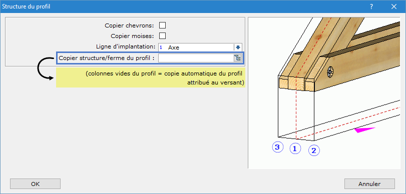 Cette récupération vous évite ainsi d’avoir à recréer la ferme une deuxième fois dans le modèle 3D. La fonction « 2 Choix Toit/Ferme – 6 Fermes/Structures – 2 Ferme du profil disponible dans le module CHARPENTE – Construction de toit permet de récupérer cette structure calculée avec DC-Statik. En laissant le champ « Copier structure/ferme du profil » vide, le logiciel lis les informations du versant et récupère automatiquement la structure du profil indiquée dans les attributs du versant choisi.
