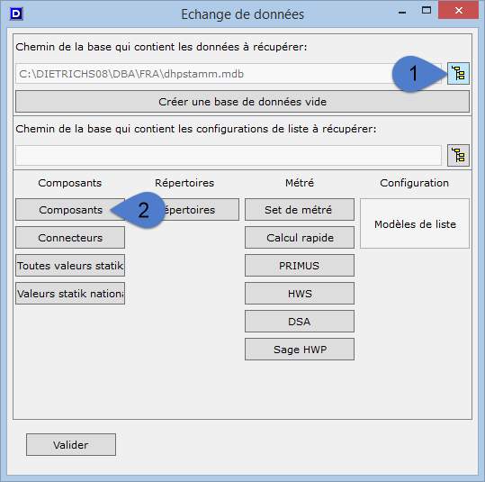 Après avoir ouvert le module Info-bâtiment, la fonction 4 Base de données – 0 Echange de données doit être appelée. Dans le premier champ, choisissez la base de données externe contenant les données à récupérer (1) et cliquez sur le bouton Composants (2) situé dans la première colonne.