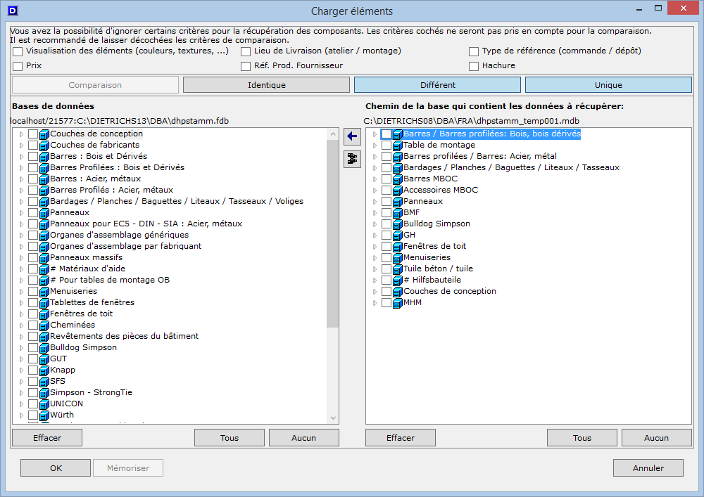 Il est parfois utile de comparer deux bases de données et de filtrer automatiquement les matériaux identiques, différents ou manquants à des fins de récupération. A compter de la version 13.04, ces actions sont désormais possibles depuis la boîte de dialogue Echange de données.