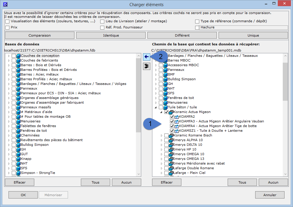 La fenêtre de gestion de l’échange de données s’ouvre immédiatement avec la base actuelle à gauche et la base externe à droite. La comparaison nécessite une analyse des deux bases et cette opération peut nécessiter un peu de temps. Lorsque l’on sait où se situent les matériaux à récupérer, il n’est pas utile de lancer la comparaison. Il suffit simplement de sélectionner les matériaux à récupérer (1) et de cliquer sur la flèche (2) pour les ajouter à la base actuelle.
