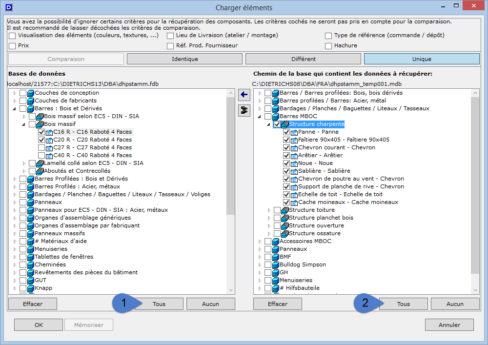 Partie gauche – base actuelle : La Réf. produit C16 R est cochée (partie gauche). Elle est surlignée en gris car la dernière sélection a été effectuée dans la partie droite de la fenêtre (base externe). Si l’on utilise le bouton Tous (1) situé dans la partie gauche de la fenêtre, l’ensemble des Réf. produit contenus dans le sous-groupe Bois-massif seront cochés. Le sous-groupe Bois-massif sera également coché.