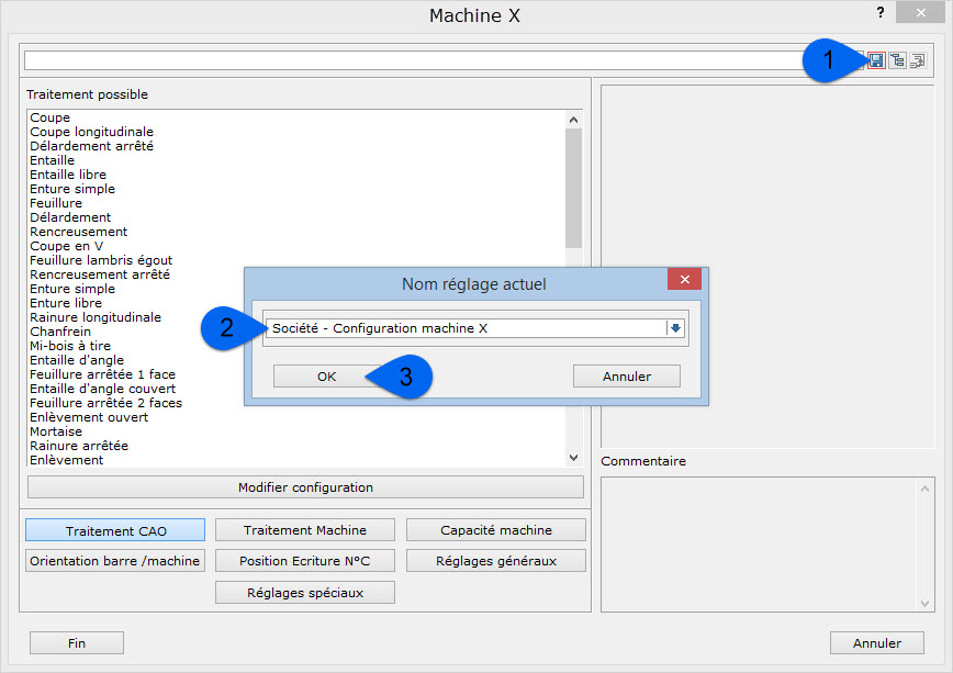 Accéder à la fonction de gestion des transfert machine disponible sous 1 Fichier – 02 Machines- 1 Transfert machine. Une fois la machine sélectionnée (champ Machine), cliquez sur l’icône « modifier » située à l’extrémité droite du champ Configuration. Enregistrez les paramètres en cliquant sur l’icône disquette (Enregistrer données actuelles) puis en renseignant un nom facilement identifiable pour ne pas le confondre avec les réglages standards installés par défaut. Il est vivement recommandé d’ajouter un code reconnaissable pour tous vos enregistrements de paramètres, par exemple en indiquant le nom de l’entreprise ou quelques lettres (ex : Société – réglage standard ou Soc – réglage standard). De cette manière, vous êtes sûr d’utiliser le bon réglage.