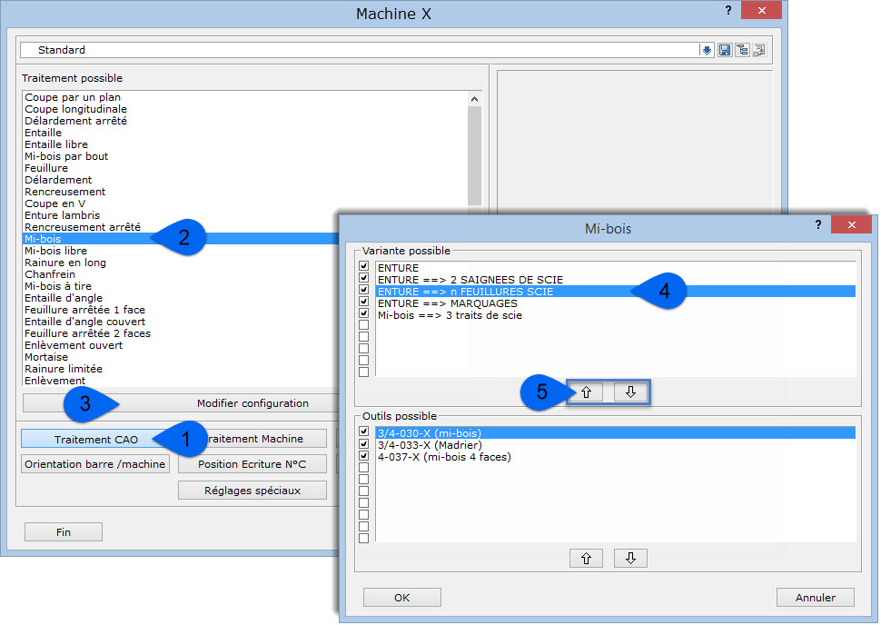 Exemple: Reprenons le cas du Mi-bois que nous avons cité précédemment et que l’on souhaite produire avec l’un des outils disponibles. Si la première variante ne peut pas être choisie en raison des valeurs limites de l’outil (ou parce que cet outil est désactivé), la variante suivante dans la liste sera choisie. Le programme recherche la première variante dans la liste qui permet de réaliser cet usinage. Dans le cas où aucune variante ne permet de le réaliser, cet usinage doit être réalisé à la main à moins qu’il soit possible de créer le traitement différemment (avec une autre fonction). Si l’on déplace la variante ENTURE ==> n FEUILLURES SCIE en haut de la liste de choix, cette variante sera choisie en priorité et le traitement sera réalisé de préférence avec la scie au lieu de la fraise universelle ou du doigt.