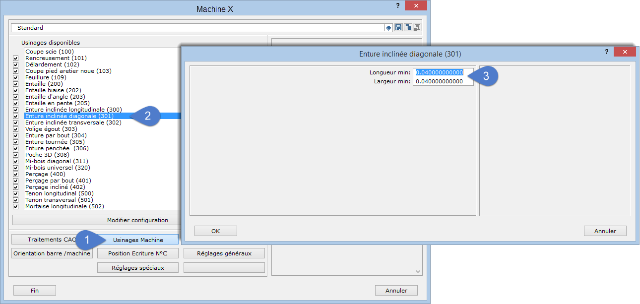 Exemple: Dans certains cas, le Mi-bois est transmis avec plusieurs coupes de scie au lieu d’utiliser la défonceuse ou la fraise universelle. Bien que la première variante disponible soit Enture et le premier usinage machine disponible soit Enture inclinée diagonale (301), la longueur minimale de l’Enture inclinée diagonale (301) doit être vérifiée sous l’onglet Usinages machine. Pour que la défonceuse ou la fraise soit utilisée correctement, le diamètre réel de l’agrégat doit être indiqué comme longueur minimale d’enture.