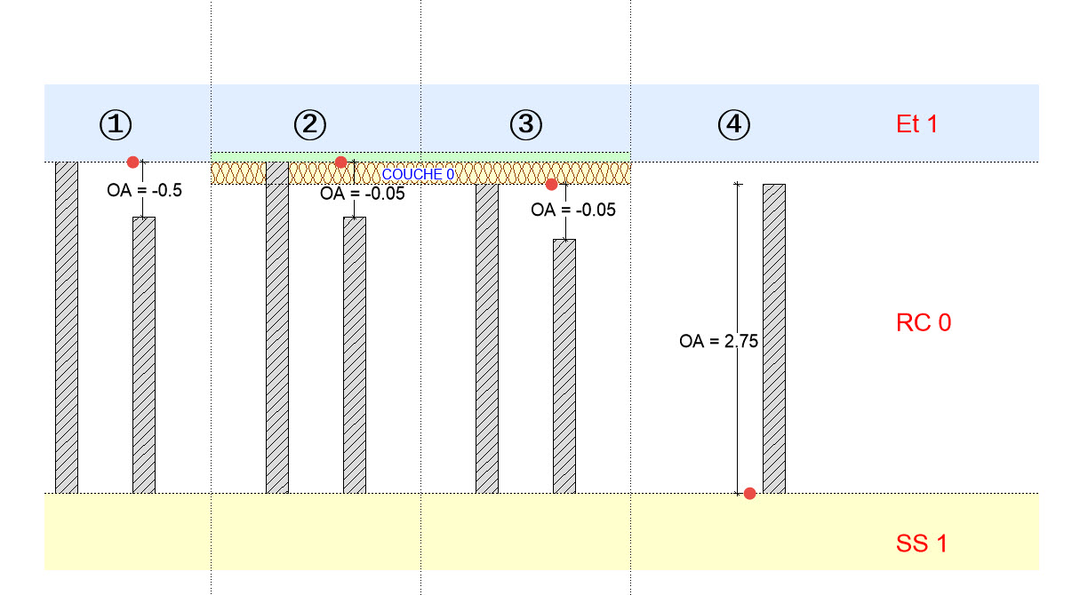 - Dessous de l’étage actuel (4) : Correspond au réglage présent dans les versions antérieures à la V13. Il faut renseigner l’écart OA = hauteur du mur depuis le bas de l’étage actuel (2.75 m dans l’exemple).