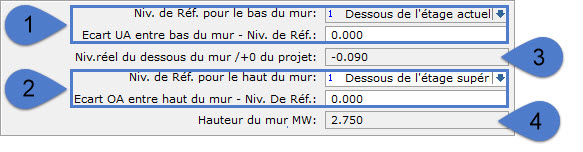 - Haut du mur : Le haut du mur est défini par rapport à un niveau de référence :